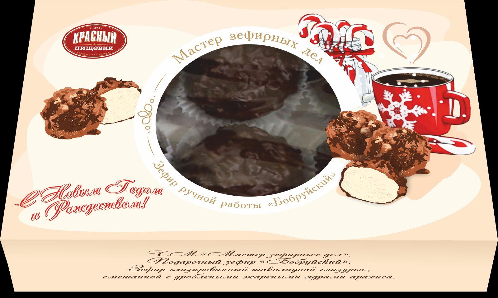 Состав: сахар, шоколадная глазурь (сахар, какао-тертое, какао-масло; эмульгаторы: лецитин соевый, Е476; ароматизатор ванилин), пюре яблочное (яблоки, консервант Е220), ядра арахиса жареные дробленые, белок яичный, патока, агент желирующий пектин цитрусовый (стабилизатор Е452i); регуляторы кислотности: цитрат натрия 3-замещенный (регуляторы кислотности: гидрокарбонат натрия, лимонная кислота), лимонная кислота; ароматизатор «Арахис». Может содержать молоко, кунжут.