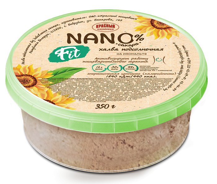 Ingredients: sunflower mass (roasted and grounded sunflower kernels), isomalt sweetener, soapwort root extract (foaming agent), "Vanilla" flavoring agent. Contains the isomalt sweetener. Excessive consumption may produce laxative effects. May contain: peanuts, sesame, nuts. Content (calculated) in 100 g of halva: isomalt 44 g, total sugar (in terms of sucrose) 2.0 g. Maximum permitted daily doze of sorbite - 30 g. Contains naturally occurring sugars. Maximum permitted daily doze of halva with isomalt - 68 g.