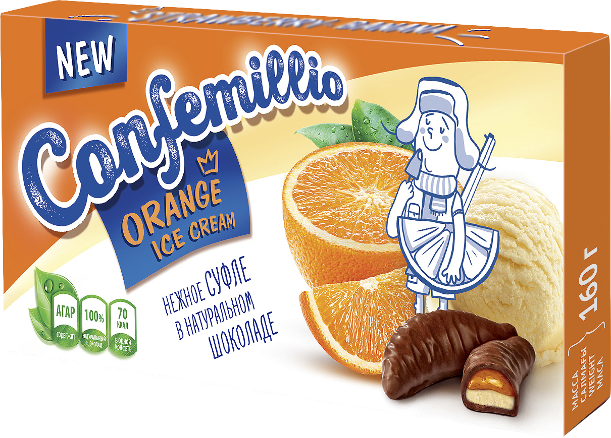 Ingredients: sugar, chocolate glaze (sugar, cocoa mass, cocoa butter; emulsifiers: soy lecithin, E476; vanillin flavoring agent), maltodextrin, egg protein, agar gelling agent, citric acid (pH adjusting agent); flavoring agents: "Ice cream", "Orange"; complex food additive coloring agent beta-carotene (antioxidants: natrium ascorbat, Alpha tocopherol; amorphous silica (anticaking agent)). May contain: milk, sulfur dioxide.