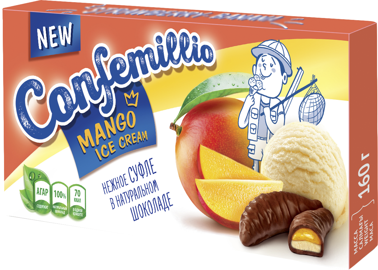 Ingredients: sugar, chocolate glaze (sugar, cocoa mass, cocoa butter; emulsifiers: soy lecithin, E476; vanillin flavoring agent), maltodextrin, egg protein, agar gelling agent, citric acid (pH adjusting agent); flavoring agents: "Mango", "Ice cream"; complex food additive coloring agent beta-carotene (antioxidants: natrium ascorbat, Alpha tocopherol; amorphous silica (anticaking agent)). May contain: milk, sulfur dioxide.