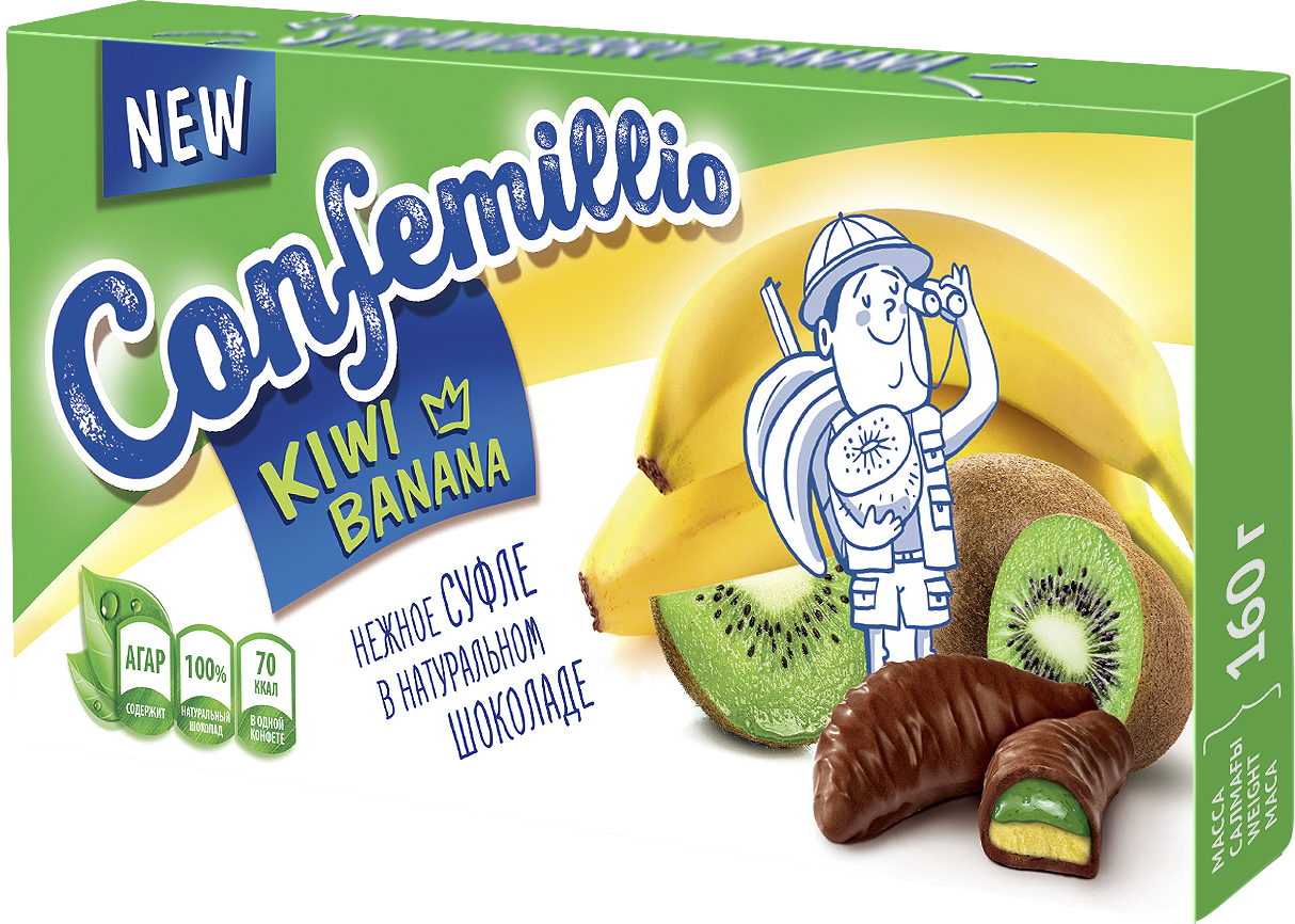 Ingredients: sugar, chocolate glaze (sugar, cocoa mass, cocoa butter; emulsifiers: soy lecithin, E476; vanillin flavoring agent), maltodextrin, egg protein, agar gelling agent, citric acid (pH adjusting agent); flavoring agents: "Kiwi", "Banana"; coloring agents: E141, curcumin. May contain: milk, sulfur dioxide.