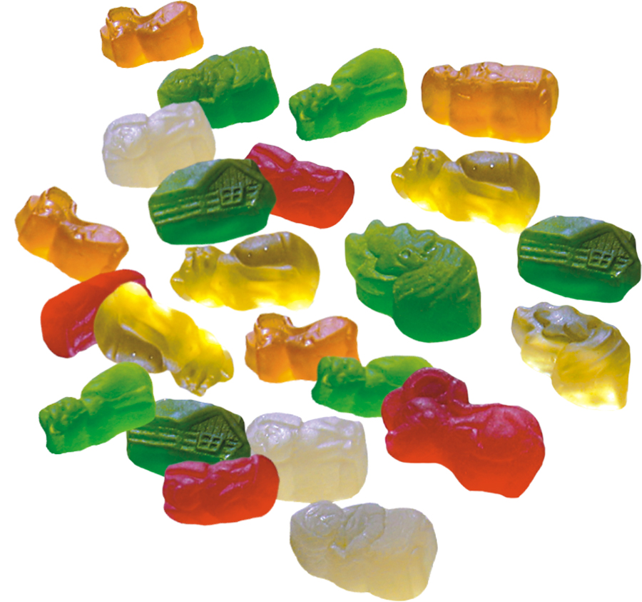 Ingredients: sugar, maltodextrin, pectin gelling agent (stabilizer E452i), pH adjusting agents: sodium citrate 3-substituted, citric acid; glazing agent (vegetable oil, carnauba wax (glazing agent), Tutti-Frutti flavoring agent, Alpha tocopherol antioxidant, citric acid (pH adjusting agent)), flavoring agents: "Pineapple", "Melon", "Tropic"; coloring agents: lutein, E141, curcumin, carmine, indigo carmine. May contain: milk, egg protein, sulfur dioxide.