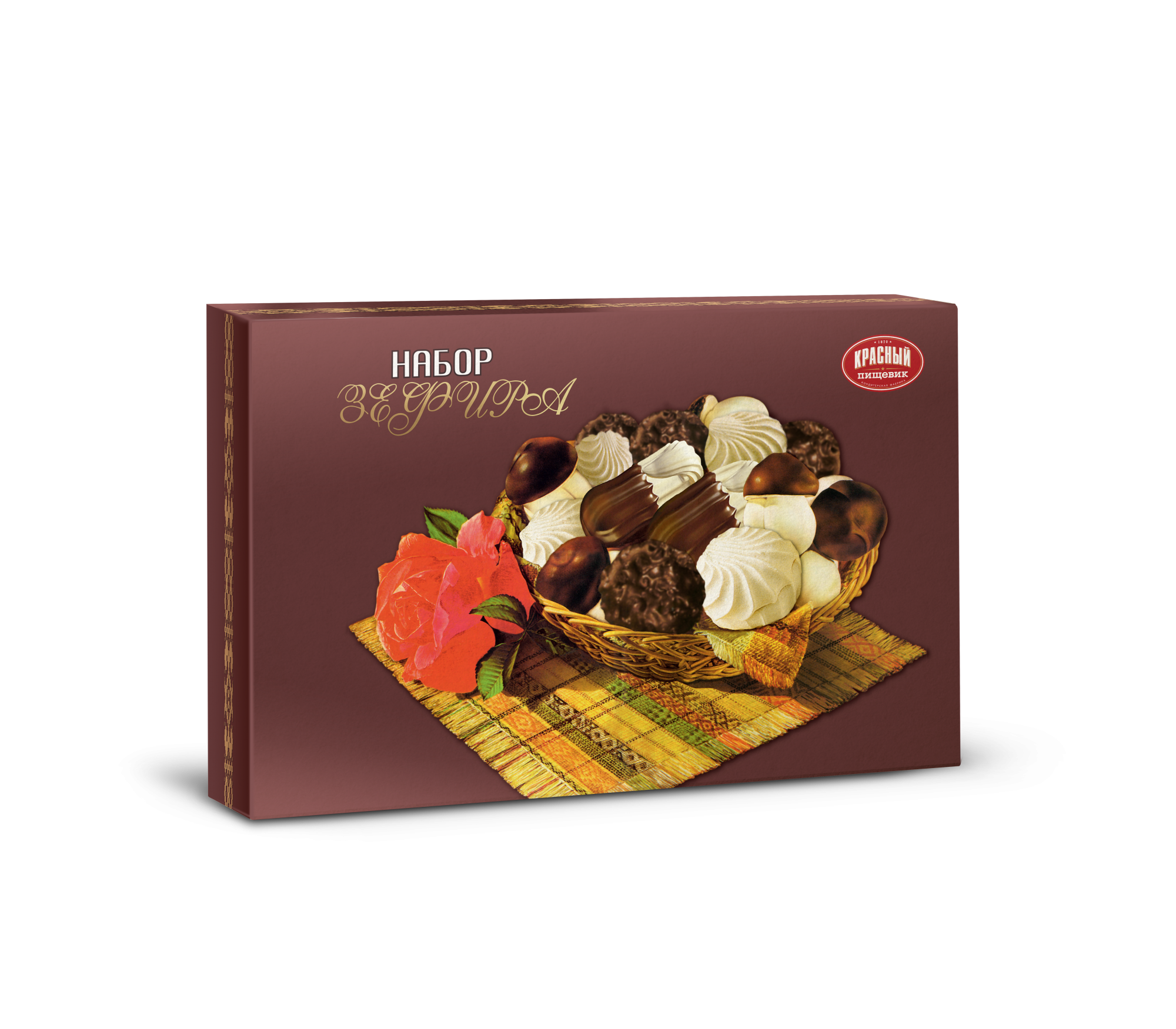 Types of zefir in the set: zefir "Bobruiskiy" glazed with chocolate icing, mixed with crushed fried peanut kernels 800 g; zefir "Fantasy" partially glazed with chocolate icing 600 g; zefir "Mushrooms" partially glazed with chocolate icing 300 g; zefir "White-and-pink" 100 g.
