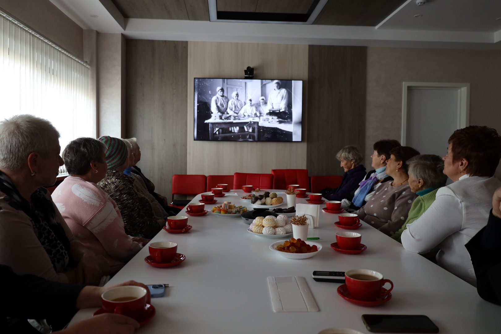 Прием начался с чаепития и просмотра корпоративного фильма о фабрике. Заместитель директора по идеологической и кадровой работе, социальным и общим вопросам Олег Викторович Малышевский, председатель профсоюзного комитета Татьяна Петровна Автомонова и председатель Совета ветеранов Александр Васильевич Маркачев тепло поприветствовали гостей и поздравили с праздником. Пожелали крепкого здоровья и бодрости духа, душевного тепла и заботы близких, спокойствия и достатка, долгих лет жизни, наполненных вниманием, уважением и радостью.