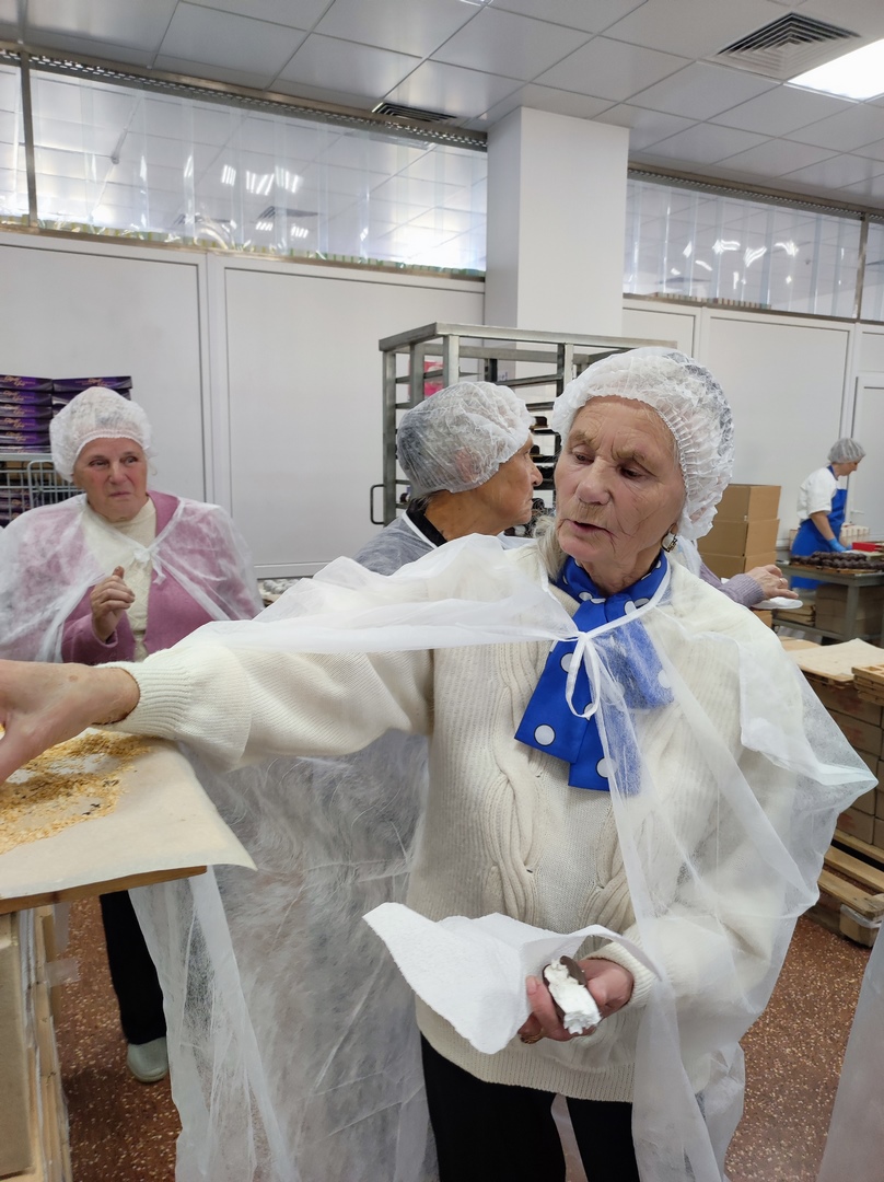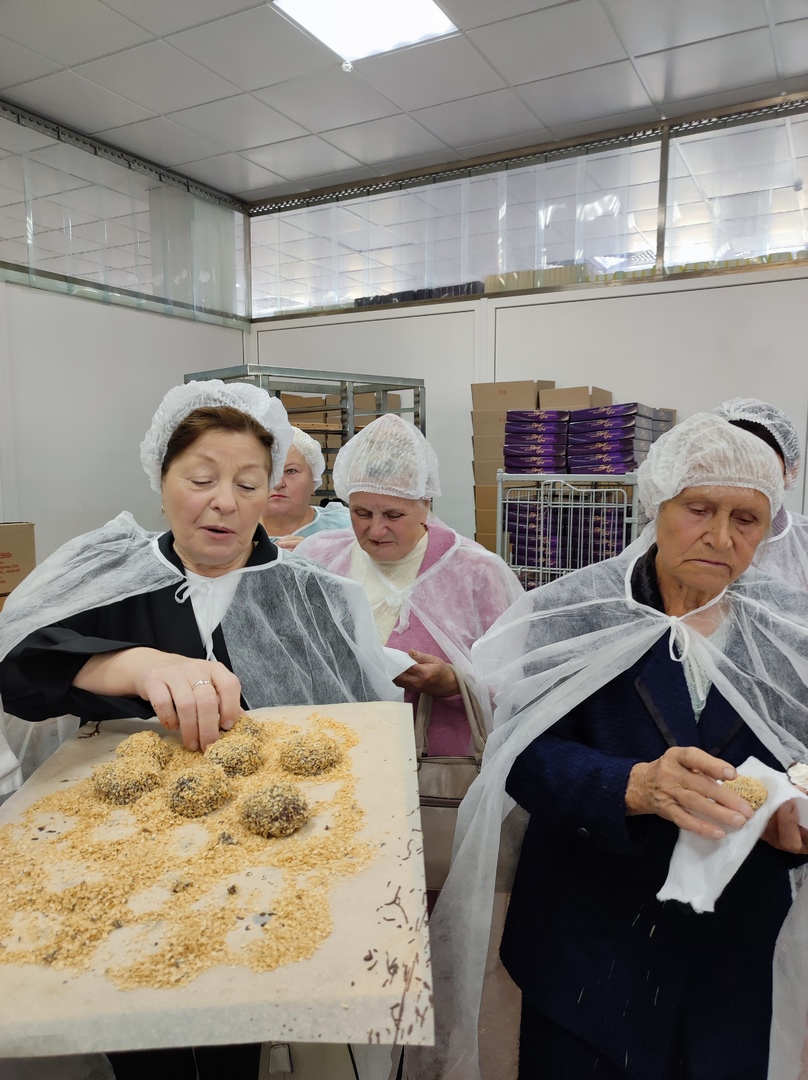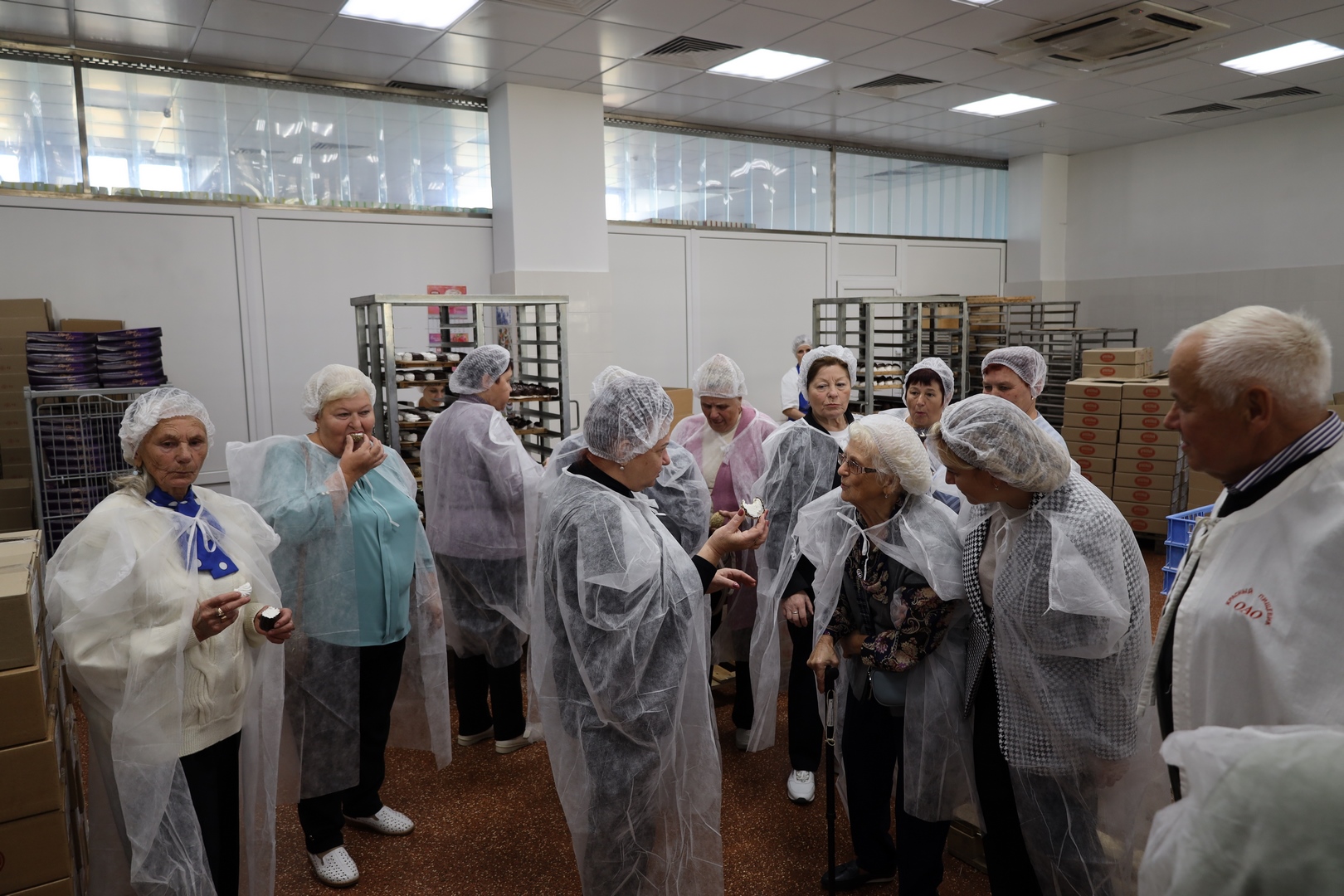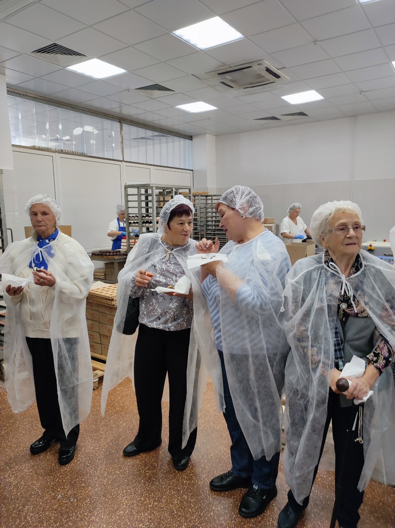 Для бывших работников предприятия это не только праздник, но и еще одна возможность отдохнуть и пообщаться друг с другом. Ветераны труда после торжественного приема посетили производственные цеха, где встретились с бывшими коллегами (с теми, кого в свое время обучали кондитерскому мастерству).