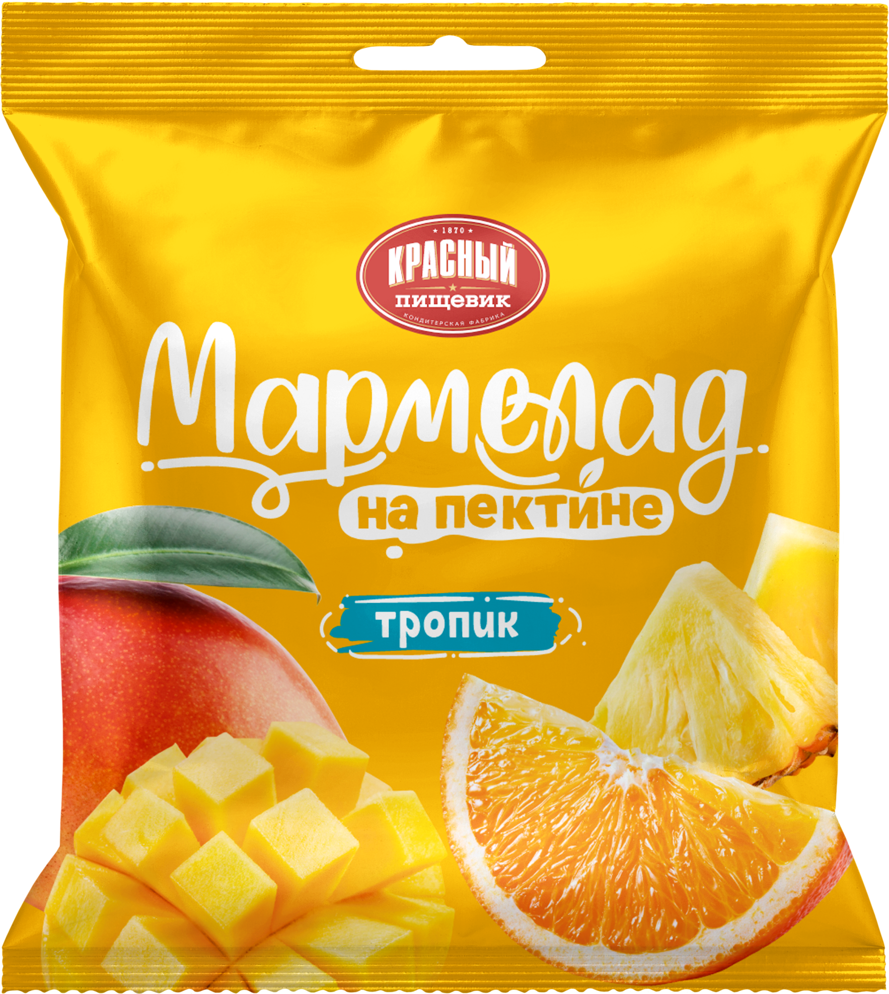 Состав: сахар, патока, загуститель Е1404, агент желирующий пектины (стабилизатор Е452і), регуляторы кислотности: лимонная кислота, цитрат натрия 3-замещенный; ароматизатор, комплексная пищевая добавка глазирователь (масло растительное, глазирователь карнаубский воск), краситель лютеин.