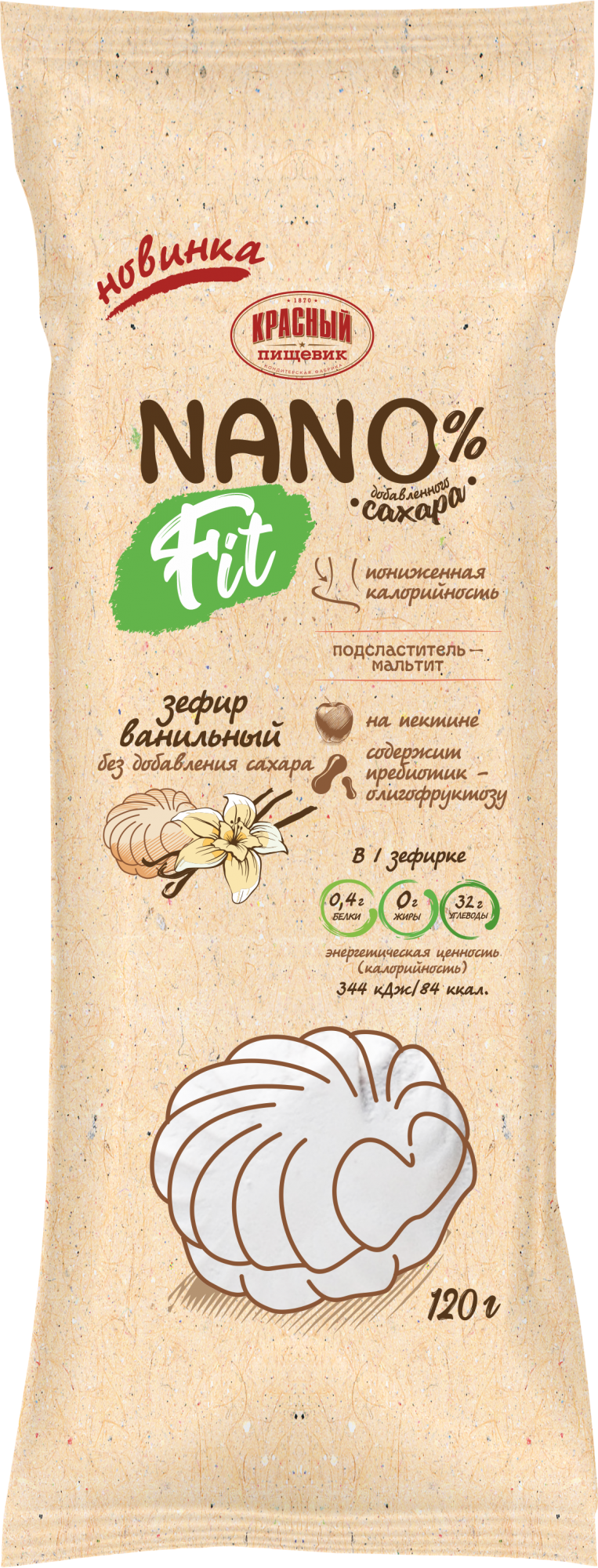 Состав: подсластители: мальтитный сироп, мальтит; пюре яблочное (яблоки, консервант диоксид серы), агент влагоудерживающий сорбит, агент желирующий пектин (стабилизаторы Е452i, Е450iii, Е450i; Е341i; декстроза), пребиотик олигофруктоза, белок яичный; регуляторы кислотности: цитрат натрия 3-замещенный, лимонная кислота; экстракт ванили, ароматизатор «Ваниль». Содержит подсластители. При чрезмерном употреблении могут оказывать слабительное действие.
